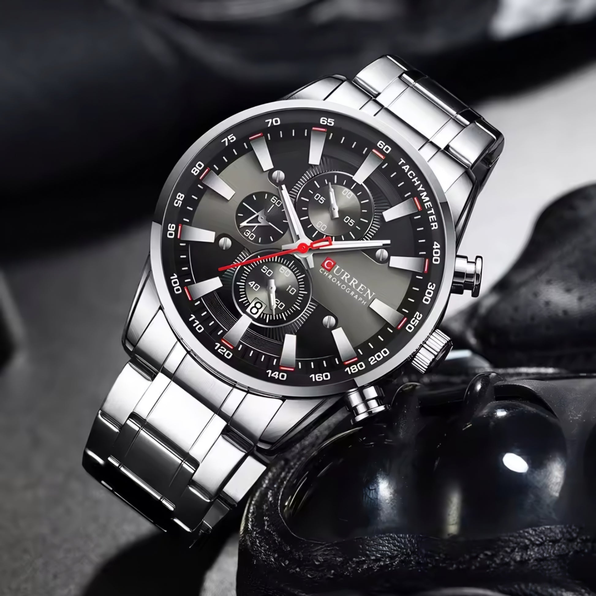 Más allá de su estética impecable, este reloj es una herramienta de precisión. Cuenta con cronógrafos funcionales (subesferas) que te permiten medir el tiempo con exactitud y un taquímetro integrado para los entusiastas de la velocidad. La correa de eslabones de acero y el cierre desplegable garantizan un ajuste seguro y cómodo.